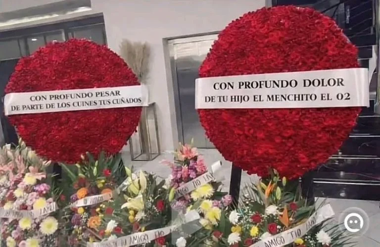 Durante el día llegaron varias coronas fúnebres, muchas sin nombre de remitente. Entre ellas destacó un arreglo floral en forma de gallo con las siglas del Cártel Jalisco Nueva Generación (CJNG). También se observaron coronas tradicionales y personas vestidas de negro en los alrededores.